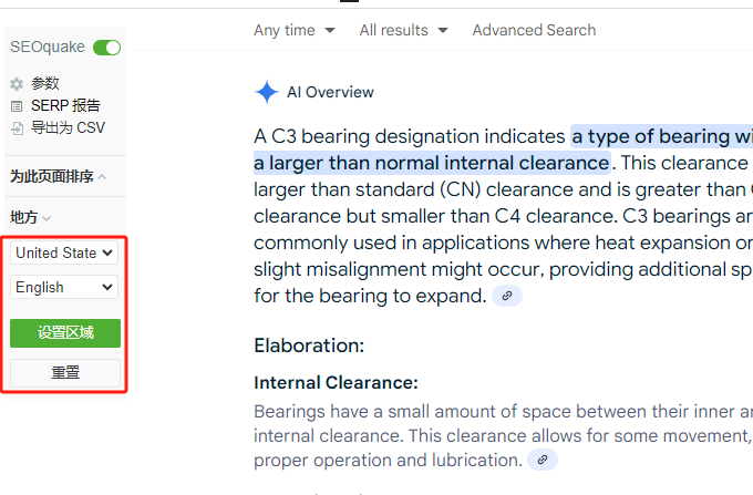 方法二:安装一个谷歌浏览器扩展插件,SEOquake。安装好之后启用它,这样在浏览器的左侧就可以看到下图设置,在地方这里选择美国、英语点击设置地区就可以了。